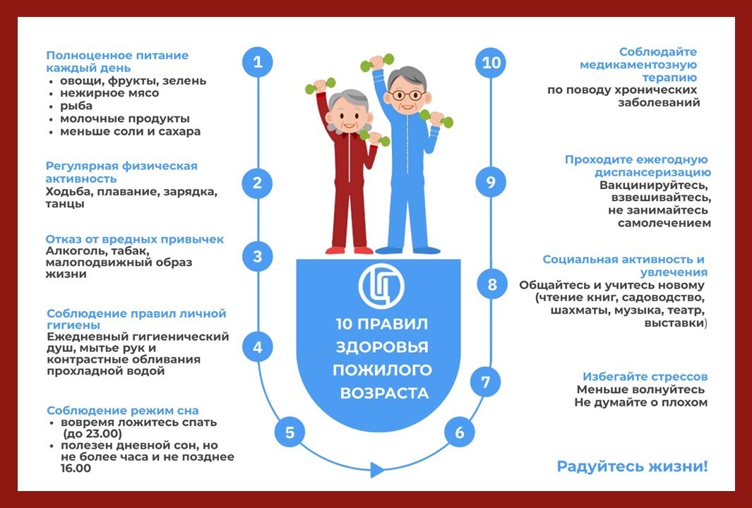 Об основных правилах здоровья в пожилом возрасте читайте в карточке.