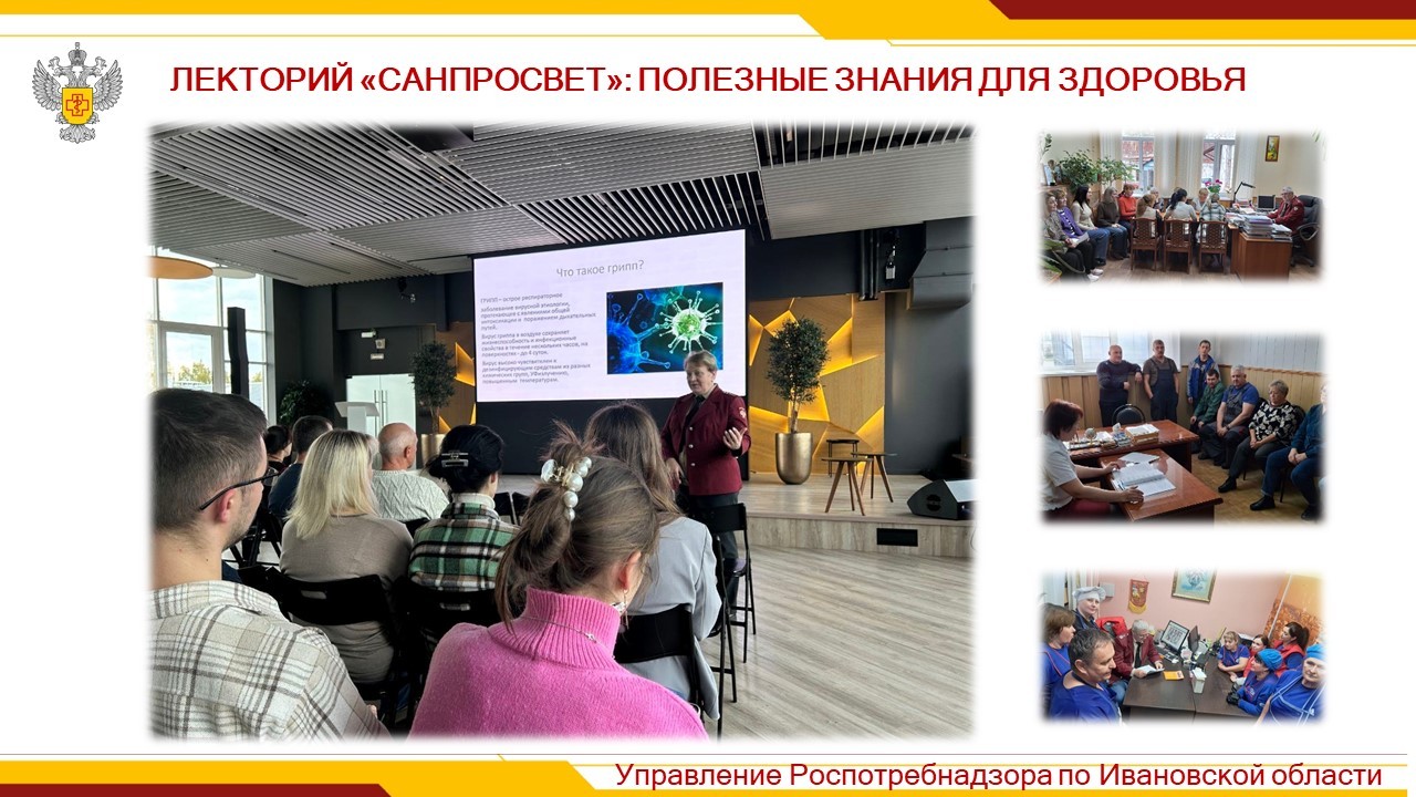 Специалисты Управления Роспотребнадзора по Ивановской области и ФБУЗ «Центр гигиены и эпидемиологии в Ивановской области» с 22 сентября по 3 октября провели тематические лекции по профилактике гриппа, ОРВИ, ВИЧ-инфекции для взрослой целевой аудитории в трудовых коллективах АО «Птицефабрика «Кинешемская», ООО «Пучежский сыродельный завод», ОАО «Тейковский молочный завод», ООО «Нейрософт», ОБСУСО «Шуйский дом-интернат», санатория «Актер - Плес» СТД РФ и других организаций региона.