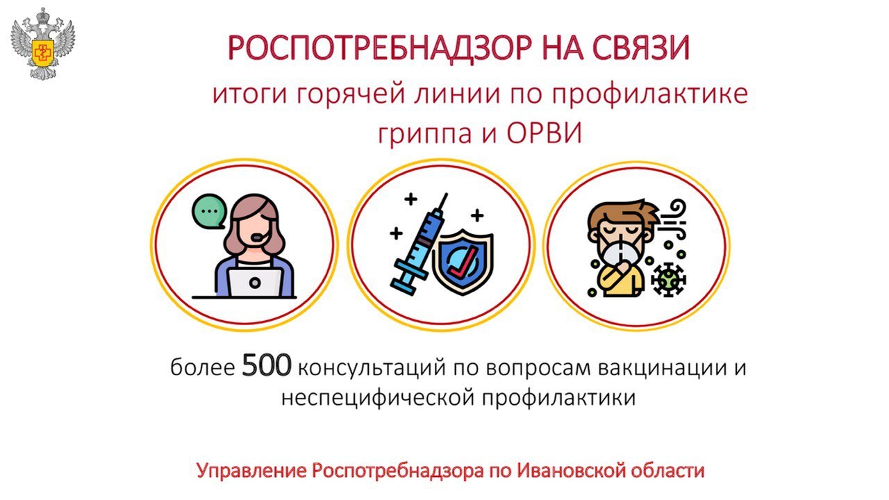 С 22 сентября по 03 октября 2025 года специалистами Управления  Роспотребнадзора по Ивановской области проведена горячая линия по вопросам профилактики гриппа и ОРВИ, на которую поступило более 500 обращений.