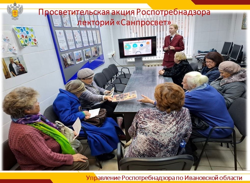 В рамках третьего этапа просветительского проекта «Лекторий «Санпросвет» специалисты Управления Роспотребнадзора по Ивановской области рассказали активистам Центра общения старшего поколения о мерах профилактики гриппа и ОРВИ, напомнили, что грипп заразен и опасен своими осложнениями, а у людей старшего возраста заболевание протекает значительно тяжелее.