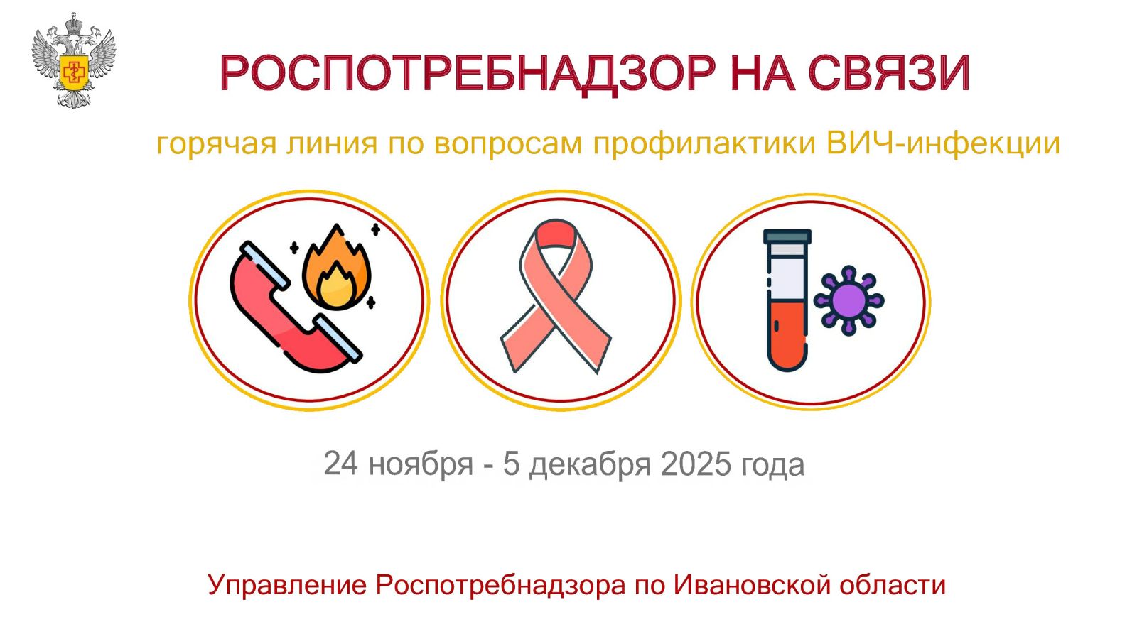 С 24 ноября по 5 декабря 2025 года в Управлении Роспотребнадзора по Ивановской области будет работать горячая линия по вопросам профилактики ВИЧ-инфекции, приуроченная к Всемирному дню борьбы со СПИДом, который отмечается 1 декабря.