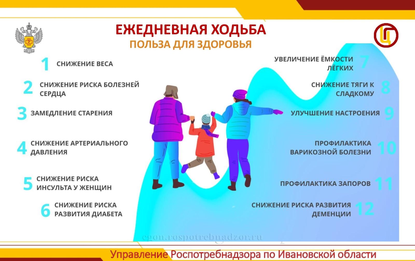 Управление Роспотребнадзора по Ивановской области напоминает, что самый простой и доступный вид физической активности – это ежедневная ходьба. Праздничные дни – хорошая возможность приобщиться к этой привычке.