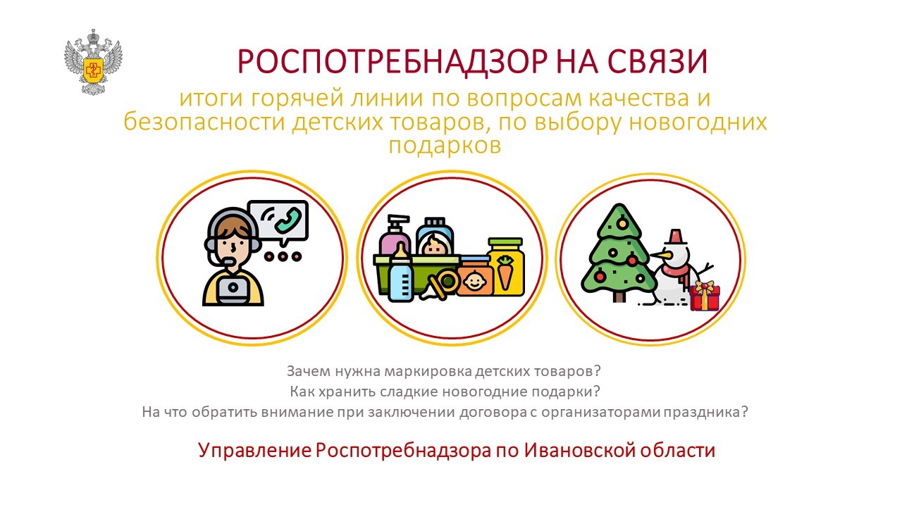С 8 по 19 декабря 2025 года специалистами Управления Роспотребнадзора по Ивановской области проведена горячая линия по вопросам качества и безопасности детских товаров, выбору новогодних подарков.