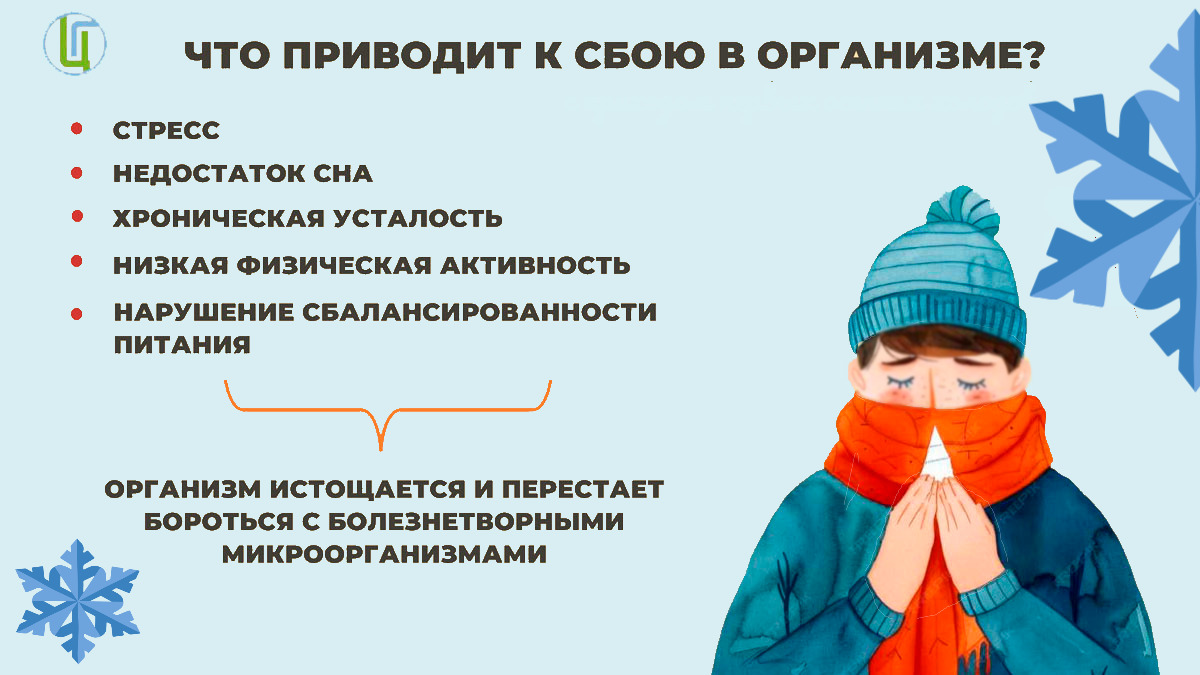 Напоминаем, что вероятность развития заболевания зависит от общего состояния человека. Стресс, недостаток сна, хроническая усталость, низкая физическая активность и неправильное питание приводят к истощению защитных сил организма, что делает его уязвимым к развитию как инфекционных, так и неинфекционных заболеваний.