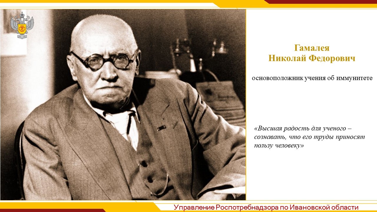 Николай Фёдорович Гамалея внес неоценимый вклад в решение этих вопросов и обогатил науку многими трудами не только по вопросам иммунологии, но и микробиологии, вирусологии, дезинфекции.