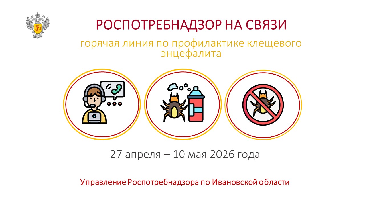 В Управлении Роспотребнадзора по Ивановской области и ФБУЗ «Центр гигиены и эпидемиологии в Ивановской области» с 27 апреля по 10 мая 2026 года работает горячая линия по профилактике клещевого энцефалита.